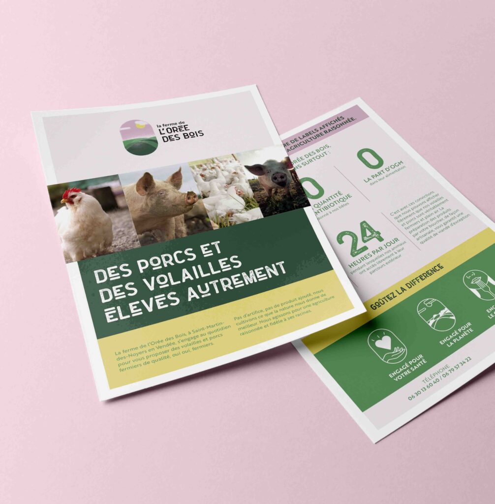 L’identité visuelle de La Ferme de l’Orée des Bois traduit avec sensibilité et précision les valeurs fondamentales du projet agricole porté par Adrien et Dimitri Lorieu : une production éthique, sans antibiotiques, sans OGM, sans intermédiaires, plus exigeante encore que le label bio. Nous avons ainsi imaginé un univers graphique qui affirme une démarche agricole artisanale, ancrée et rigoureuse.