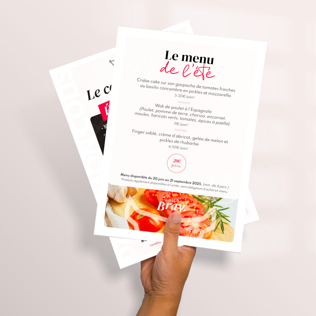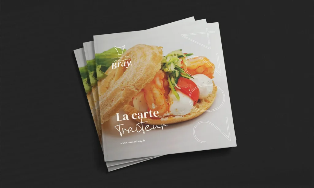 Le nom « Maison Bray » gagne en impact grâce à un bloc typographique plus imposant, facilitant son identification rapide. Le choix d’un contraste typographique entre une serif élégante et structurée et une manuscrite plus libre et chaleureuse vient traduire l’essence de la marque : un savoir-faire traditionnel incarné dans une maison conviviale et généreuse.